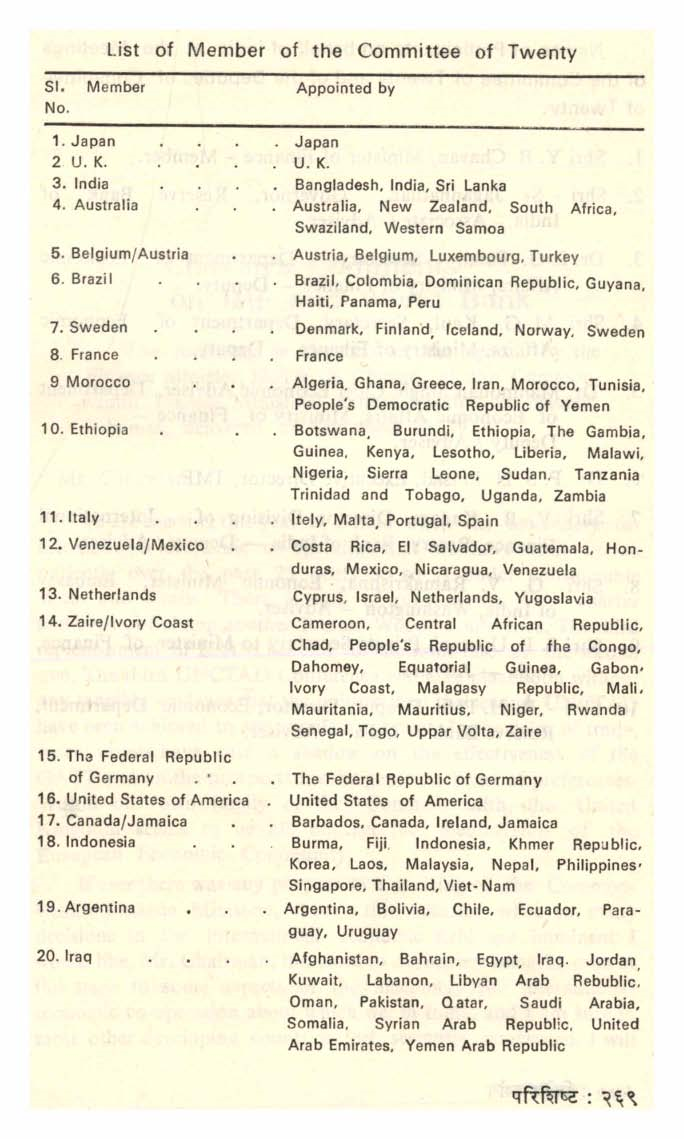 The Committee of Twenty consisted of Finance Ministers/ Governors of Central Banks representing the twenty constituencies into which the members of the I. M. F. are divided for purposes of appointing / electing an Executive Director. The Committee was assisted in its work by a Group of Deputies consisting of senior Officials dealing with monetary and financial matters. The constituency consisting of India, Bangladesh and Sri Lanka was represented on the Committee of Twenty by the Finance Minister of India, Shri. Y. B. Chavan. In all, the Committee held six meetings. Its final meeting was held in Washington D. C. on June 12-13, 1974. The Deputies held in all twelve meetings, and Dr. Manmohan Singh, Chief Economic Adviser, functioned as India’s Deputy at most of these meetings. Dr. P. S. N. Prasad also attended these meetings as Executive Director of the I. M. F. representing India, Bangladesh and Sri Lanka.