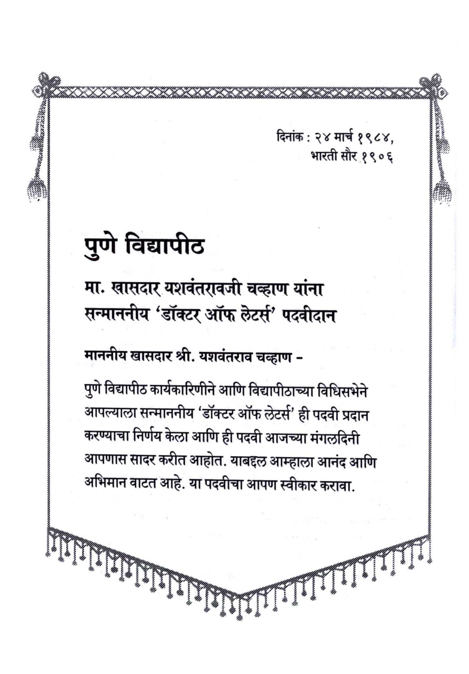 श्री. यशवंतराव बळवंतराव चव्हाण यांना 'डॉक्टर ऑफ लॉज' ही सन्मान्य पदवी आपण अर्पण करावी अशी मी आपल्याला नम्र विनंती करतो.